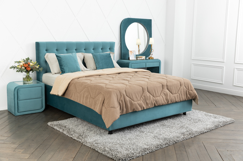 140×200 или 160×200 с тонкими царгами, изголовье-щит толщиной 3–5 см, ножки 12–15 см, проходы 60–65 см. Тумбы — полки или консоли, чтобы не «съедать» коридор.