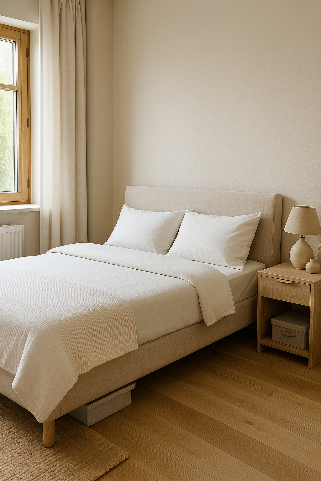 Финальный штрих — текстиль и освещение Светлое бельё, лёгкие шторы, мягкий рассеянный свет возле изголовья — всё это помогает визуально увеличить пространство и делает маленькую спальню по-настоящему уютной.