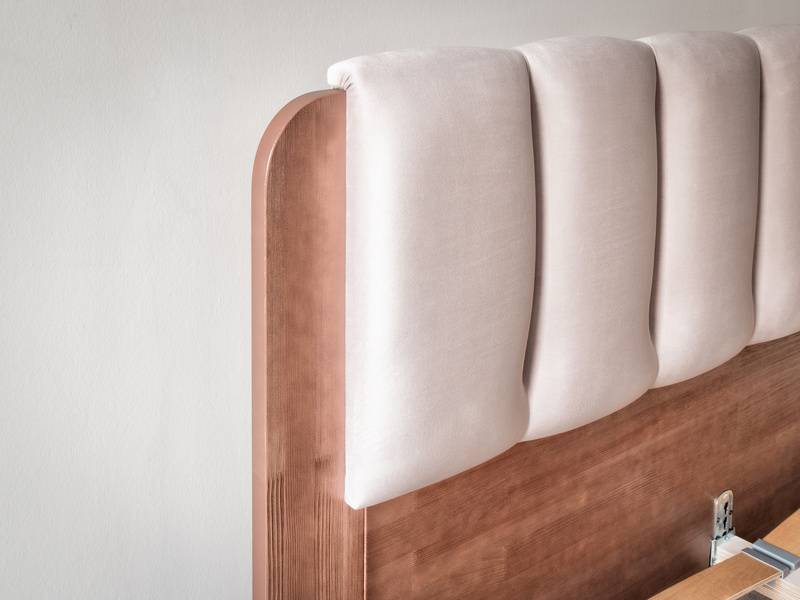 Скруглённые углы в изножье, выполненные по новой технологии, делают кровать не только стильной, но и травмобезопасной. Минимальные зазоры между царгами и матрасом обеспечивают аккуратный, завершённый вид.