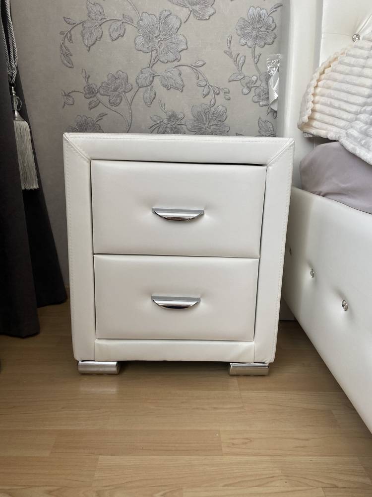 - Модель изготовлена из ДСП. Царги кровати выполнены из ДСП, спинка из фанеры. Обивка кровати может быть выполнена из экокожи класса «люкс» или мебельной ткани.